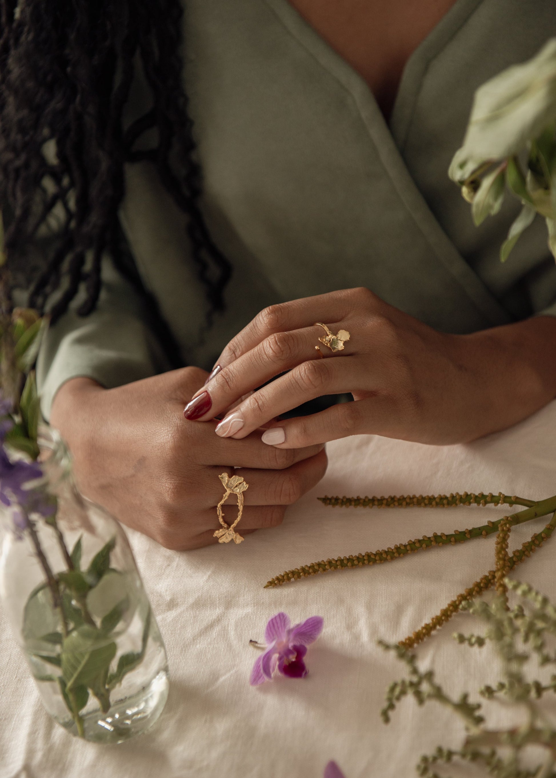 Un anillo lleno de movimiento y fluidez, con curvas orgánicas que evocan la armonía de la naturaleza. Cada detalle ha sido cuidadosamente tallado a mano, creando una pieza única y expresiva.