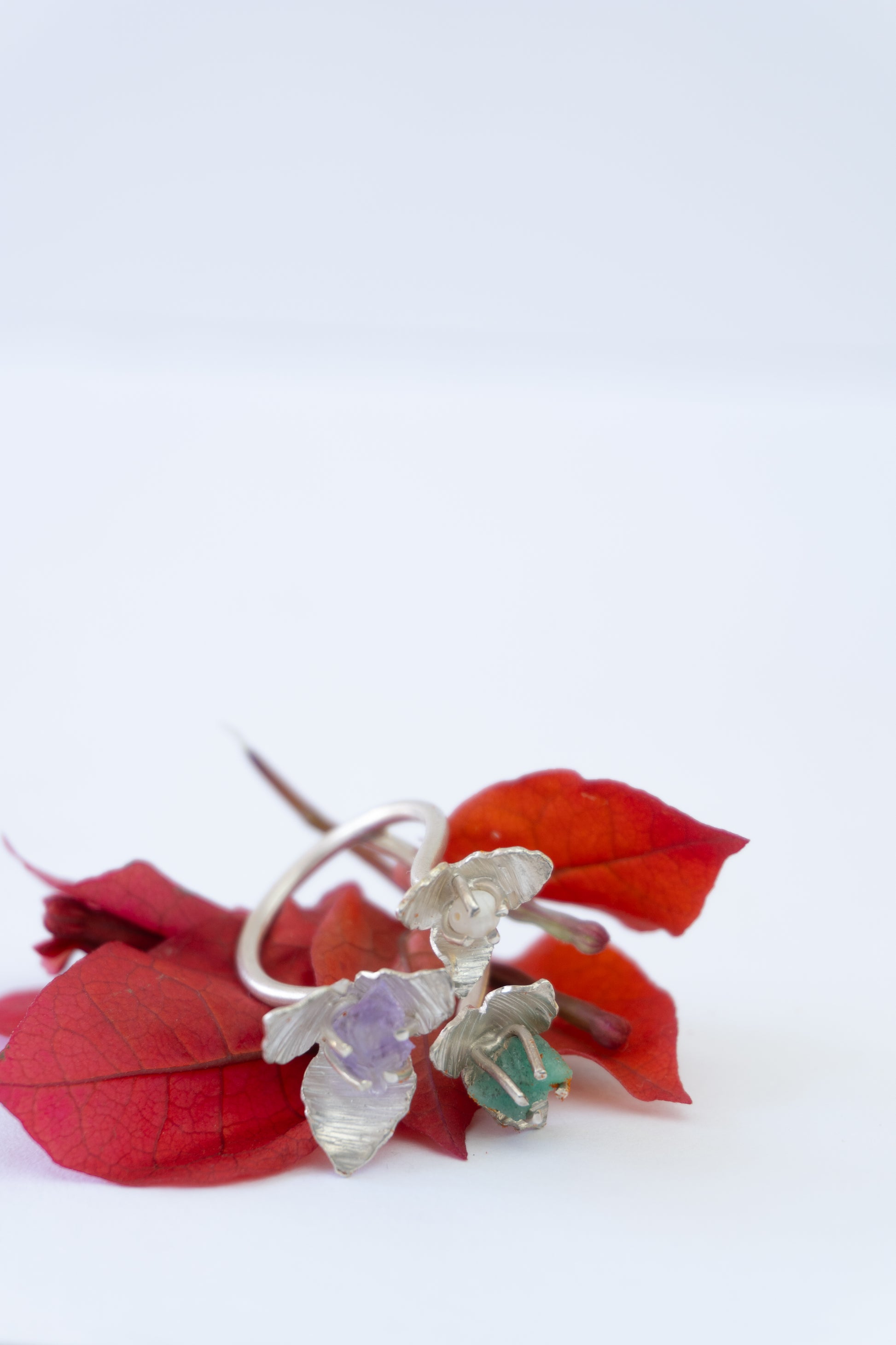 El anillo Jardín de la Veranera está inspirado en las formasde los pétalos y sus colores representados por piedras naturales como Amatista, Perla y Esmeralda en. bruto. Cada flor es martillada a mano y elaborado en plata ley 950.