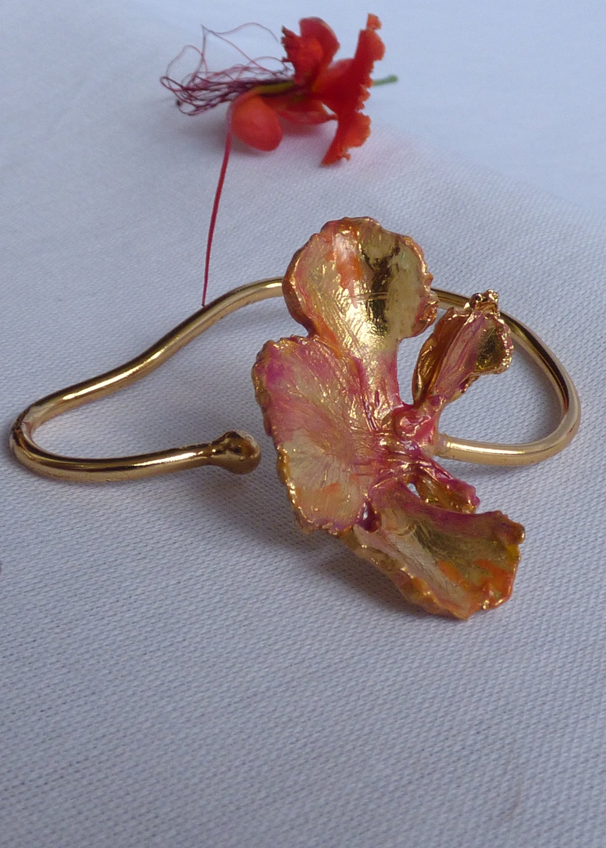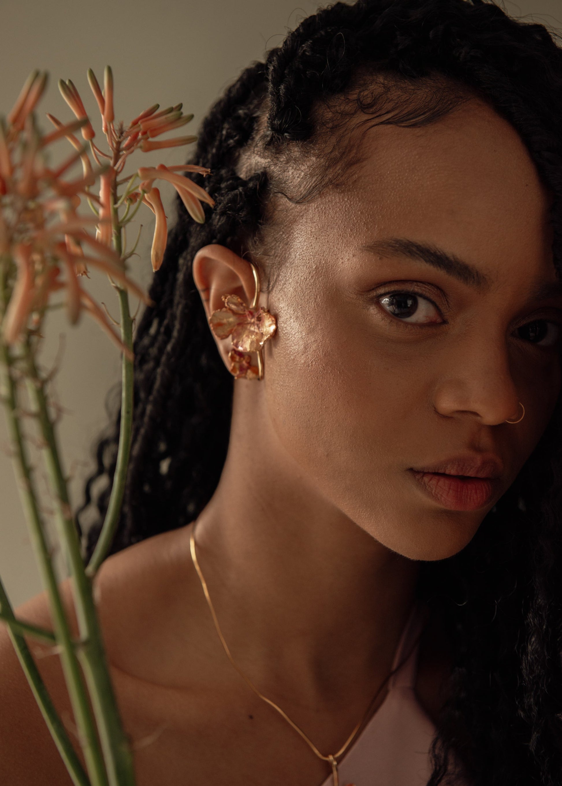 Una pieza fluida que abraza la oreja con un diseño inspirado en la naturaleza. Su forma orgánica refleja el movimiento de los pétalos del árbol Flamboyán (Acacia Roja), esculpida a mano para capturar su esencia en metal. No requiere perforación, se ajusta suavemente a la oreja, brindando comodidad y estilo.