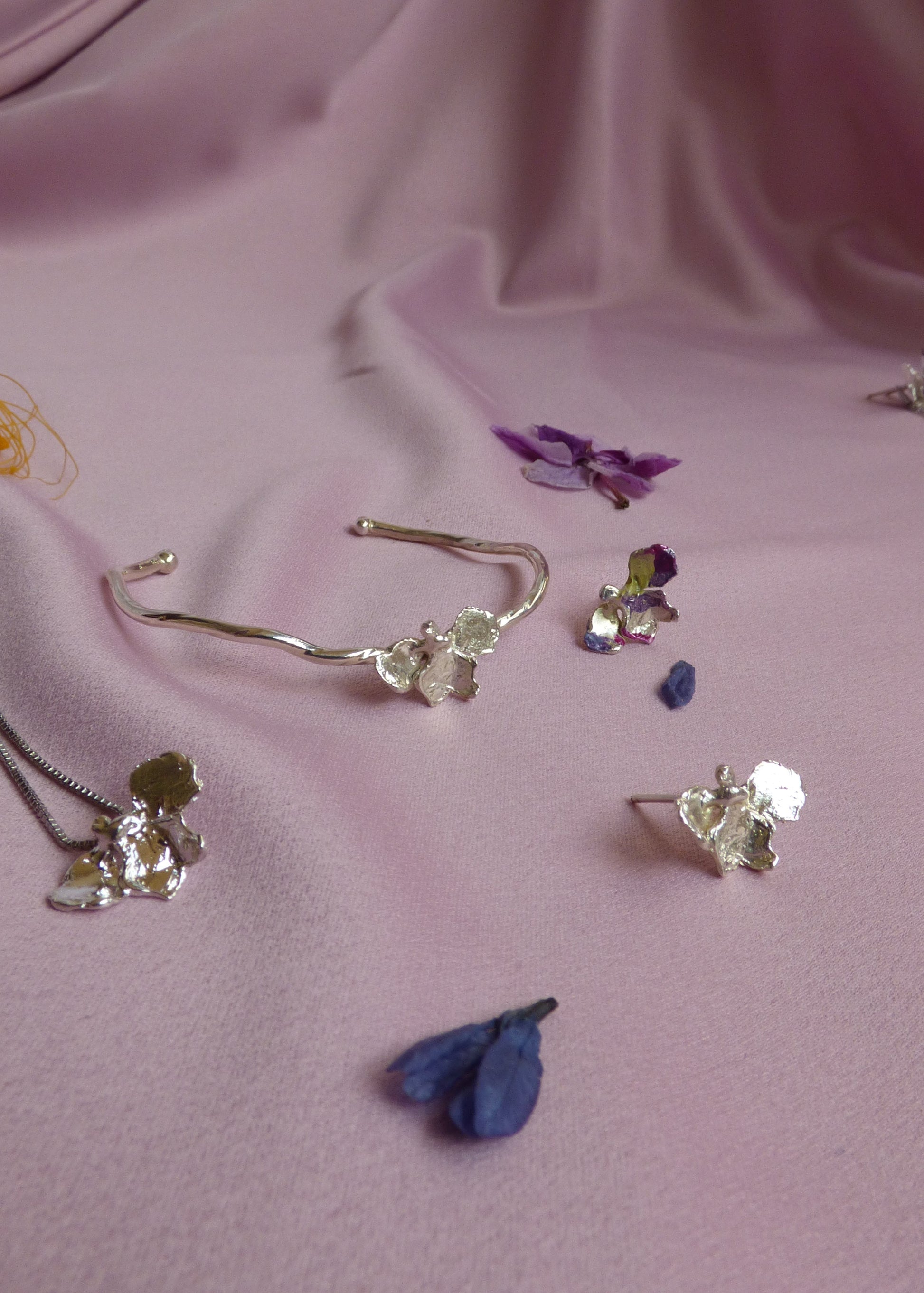 Un diseño sutil y elegante que captura el movimiento y la fluidez en un dije en forma de pétalo, elaborado a mano con detalles orgánicos. Su hilo delicado aporta ligereza y comodidad, convirtiéndola en una pieza perfecta para el día a día.