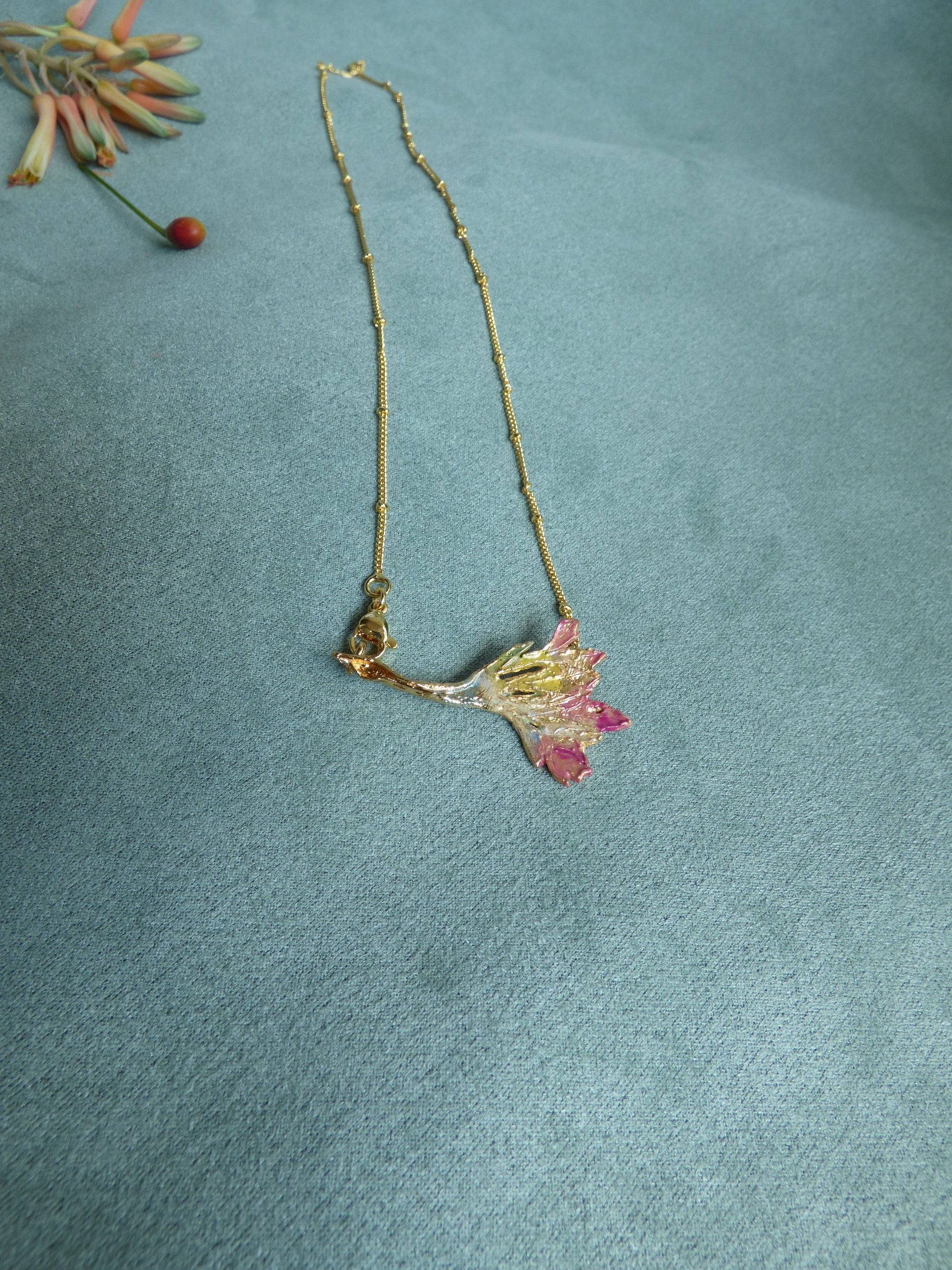 Un tributo a la naturaleza y su armonía. Inspirado en la delicada flor Corazón Herido (Dicentra spectabilis), este collar captura la esencia de sus capullos colgantes, resaltando su forma orgánica y su movimiento natural. Cada pétalo ha sido esculpido a mano y pintado con dedicación, creando una pieza única llena de vida.
