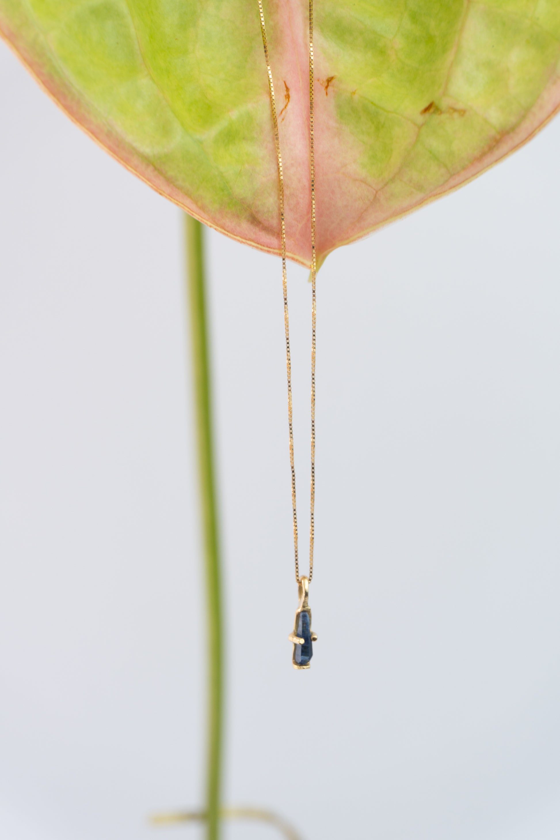 Inspirado en el profundo azul del mar el Zafiro natural como protagonista del collar engastado en oro de 18k. Este collar de tamaño de 1 cm aprox, elaborado en oro de 18k con Zafiro en bruto natural. Cada colgante es martillado a mano, resaltando texturas únicas que hacen de cada pieza un detalle especial para el día a día.